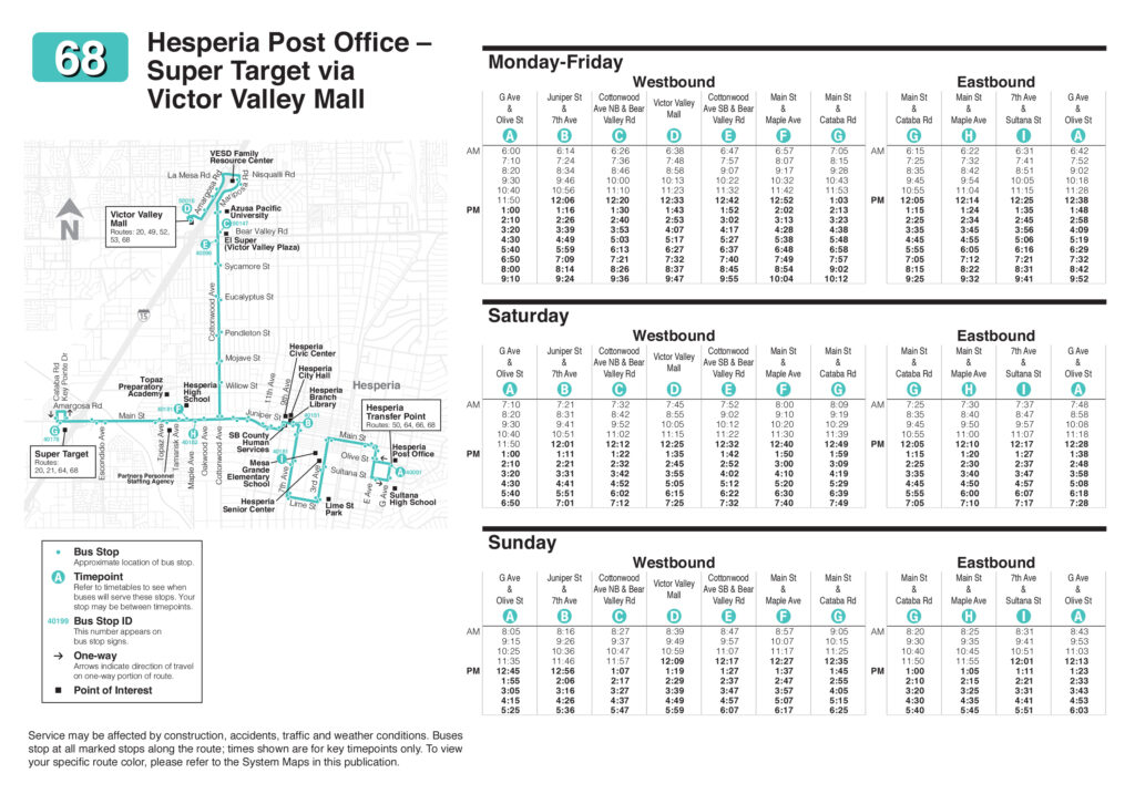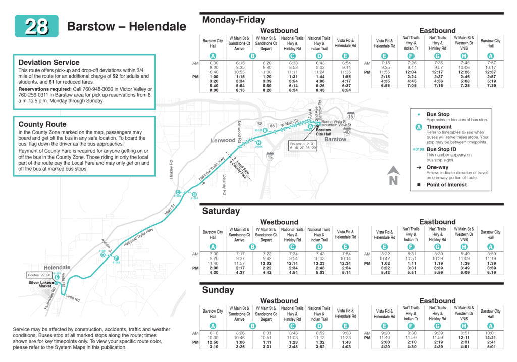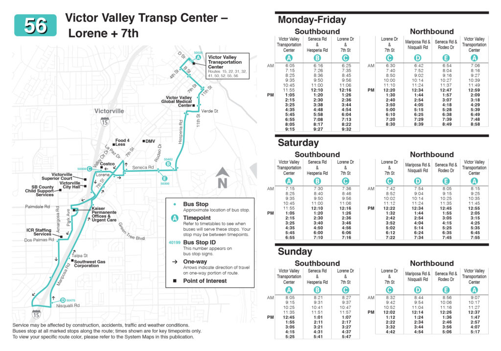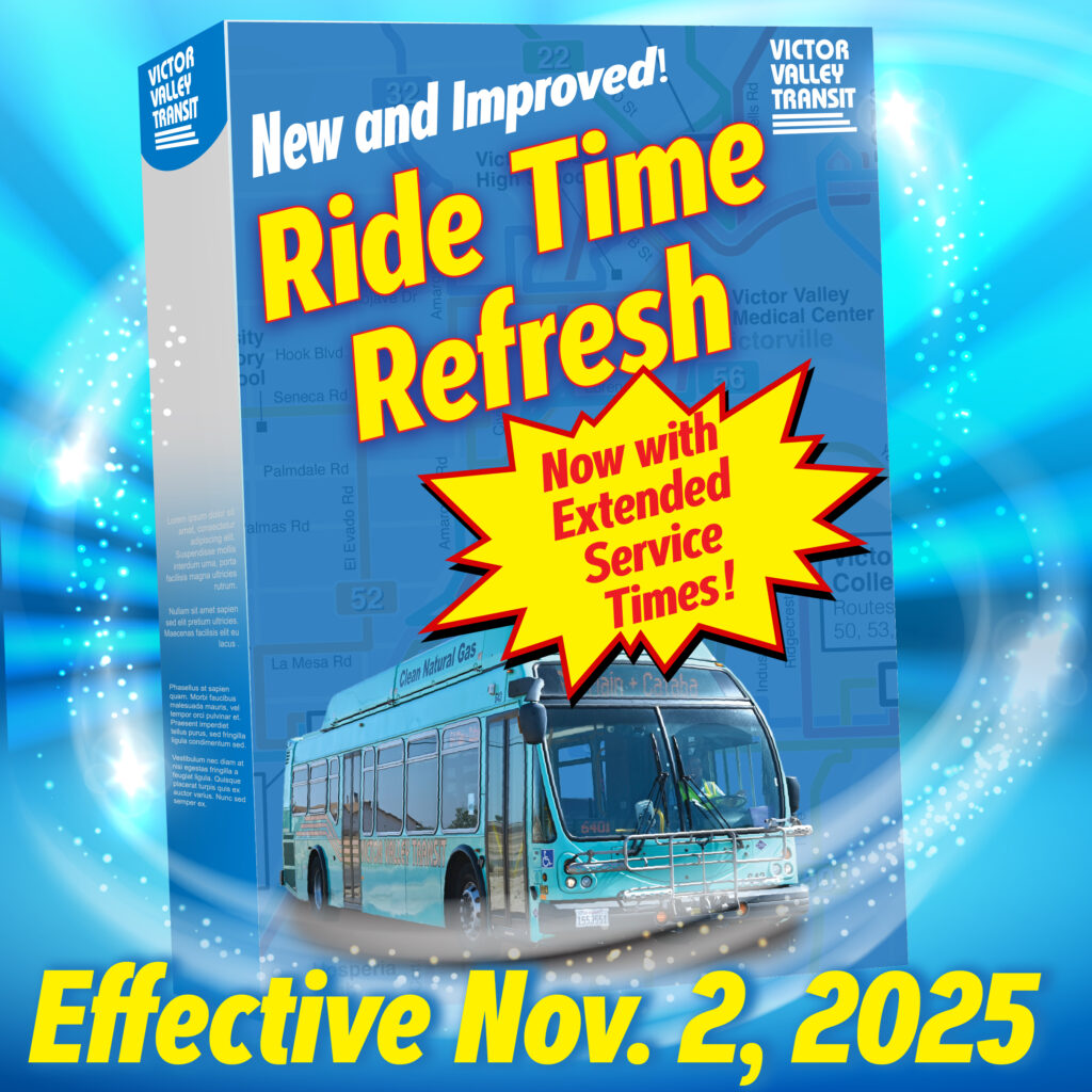 Victor Valley Transit Authority (VVTA) is proud to announce the upcoming Ride Time Refresh 2025 service adjustment, taking effect on Sunday, November 2, 2025. While routes themselves will remain unchanged, VVTA is introducing updated service times designed to better meet the needs of riders across the High Desert. To support late day commuters and essential workers, weekday evening service hours will be extended on Routes 1, 2, 3, 6, 31, 32, 41, 43, 47, 50, 52, 53, 55, 56, 64, and 68. Additionally, the Saturday service frequency will be enhanced on Routes 27, 28, and 29, offering more convenient travel options for weekend riders.